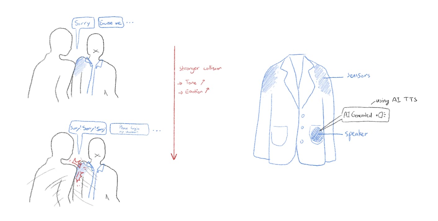 Handmade pressure sensors sewn into each shoulder detect collisions and measure the intensity of the impact. The jacket uses a Raspberry Pi Pico 2W to request an appropriate apology sentence through the OpenAI API, which is then spoken aloud using speech API. A light bump triggers a short response, while a stronger impact produces a more dramatic one.