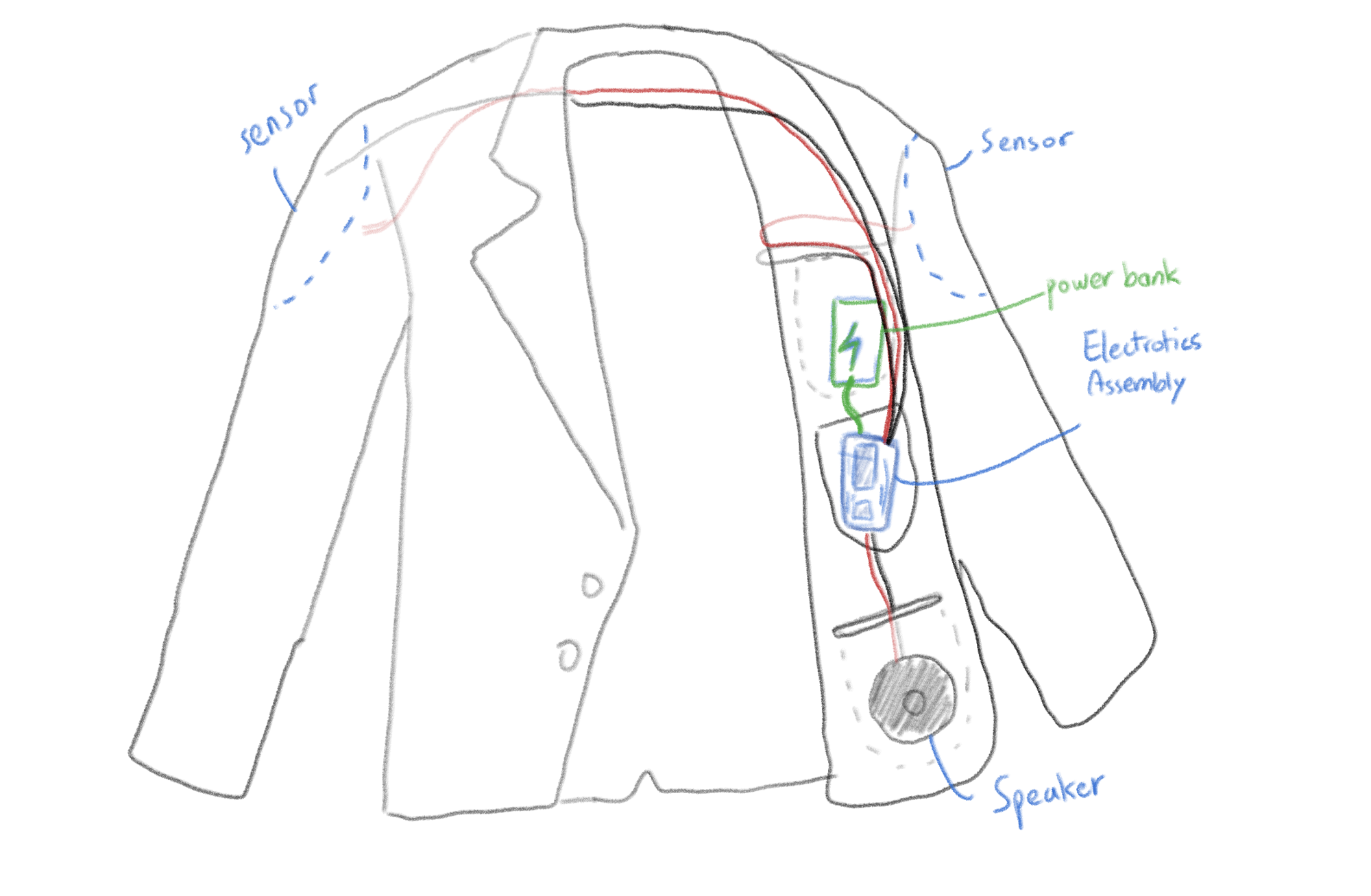 Handmade pressure sensors sewn into each shoulder detect collisions and measure the intensity of the impact. The jacket uses a Raspberry Pi Pico 2W to request an appropriate apology sentence through the OpenAI API, which is then spoken aloud using speech API. A light bump triggers a short response, while a stronger impact produces a more dramatic one.