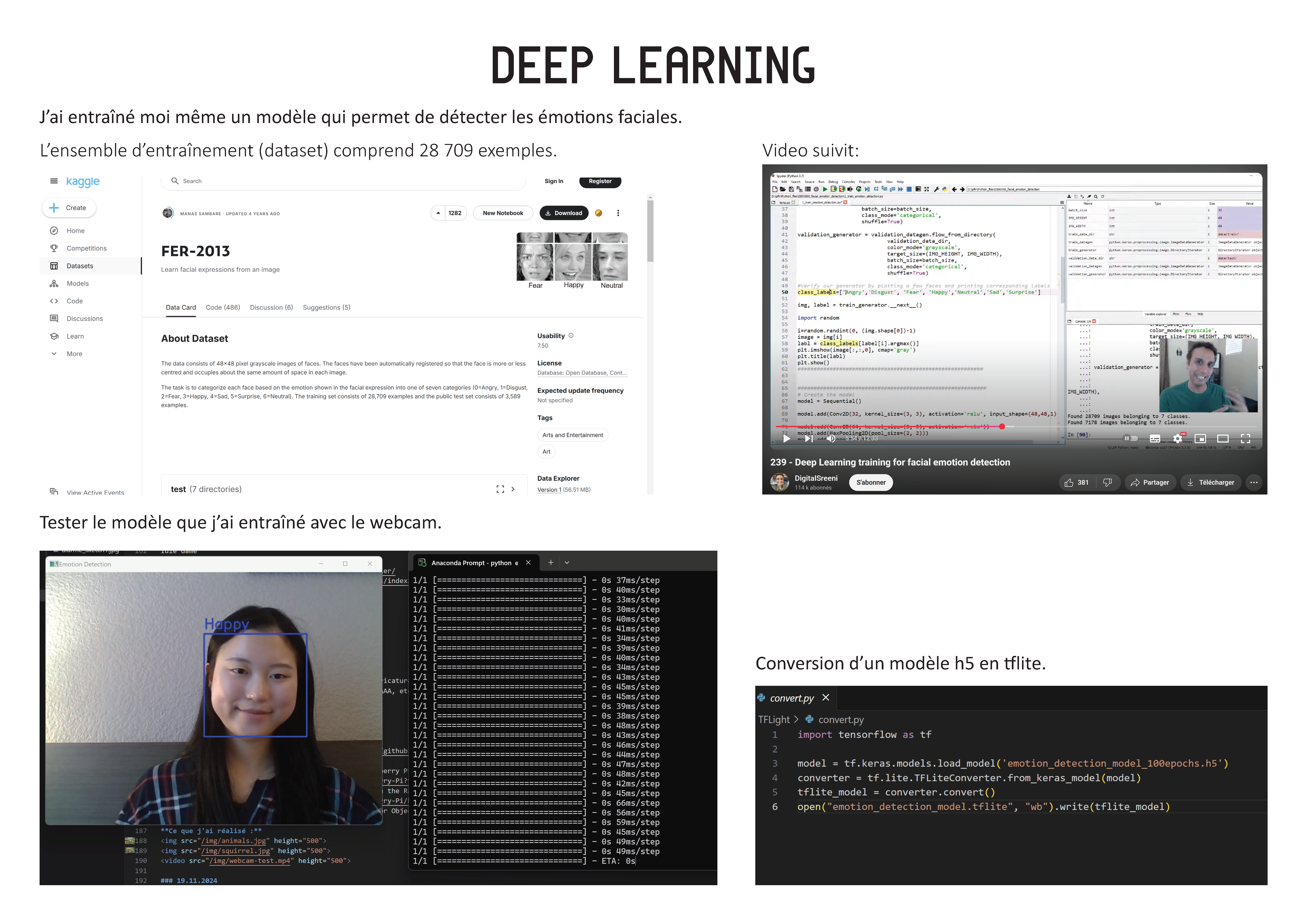 For facial recognition, I used TensorFlow Lite as the execution engine and Python for the script. I personally trained a model capable of detecting facial emotions using 28,709 training images. To do this, I followed a tutorial and used the dataset provided by the YouTuber Digital Sreeni.