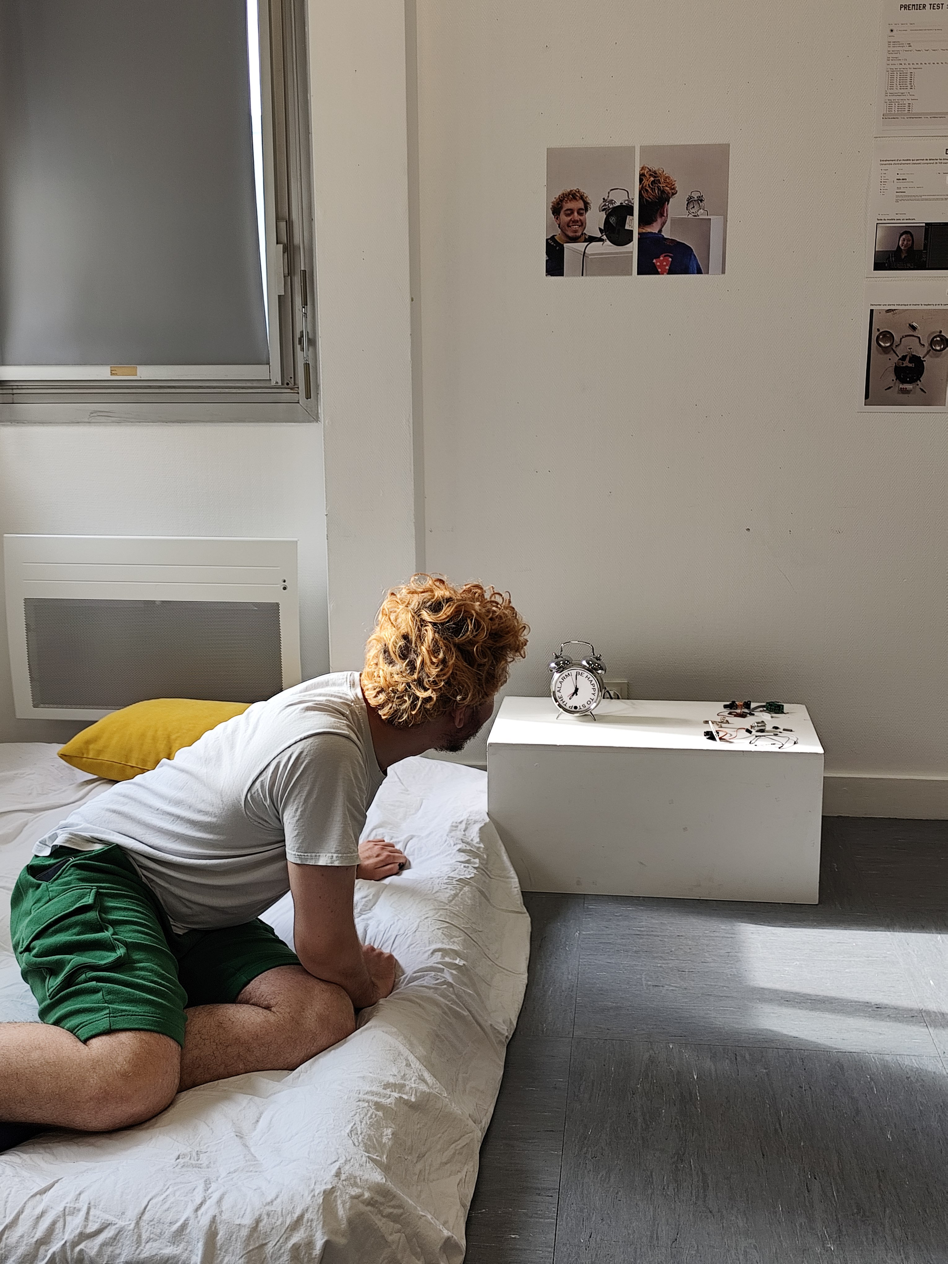 We all struggle to get up in the morning, and a conventional alarm clock does not necessarily provide a pleasant wake-up experience. Based on this observation, I created Be Happy to Stop the Alarm, an alarm that can only be turned off by smiling. The smile is detected using artificial intelligence.