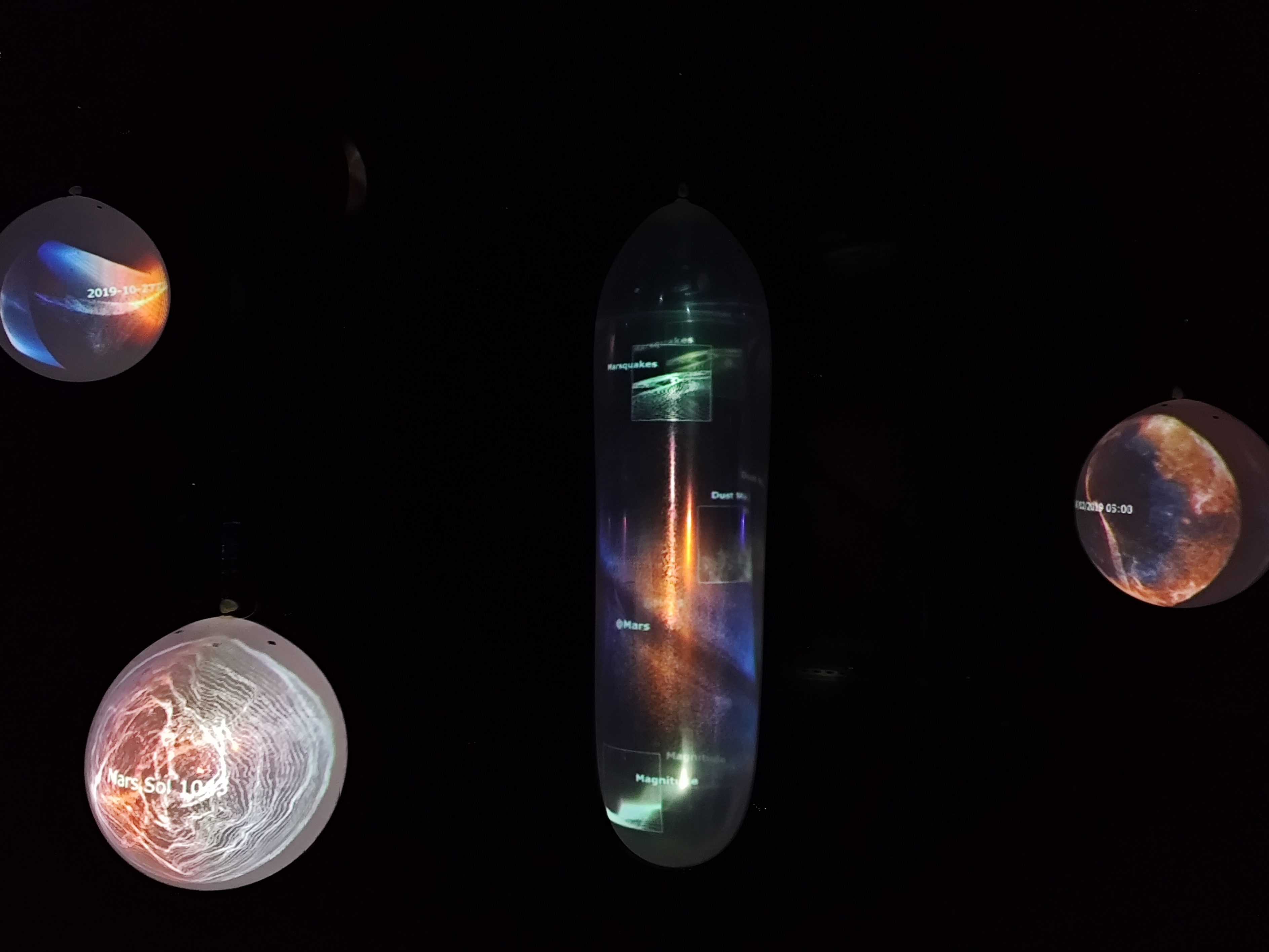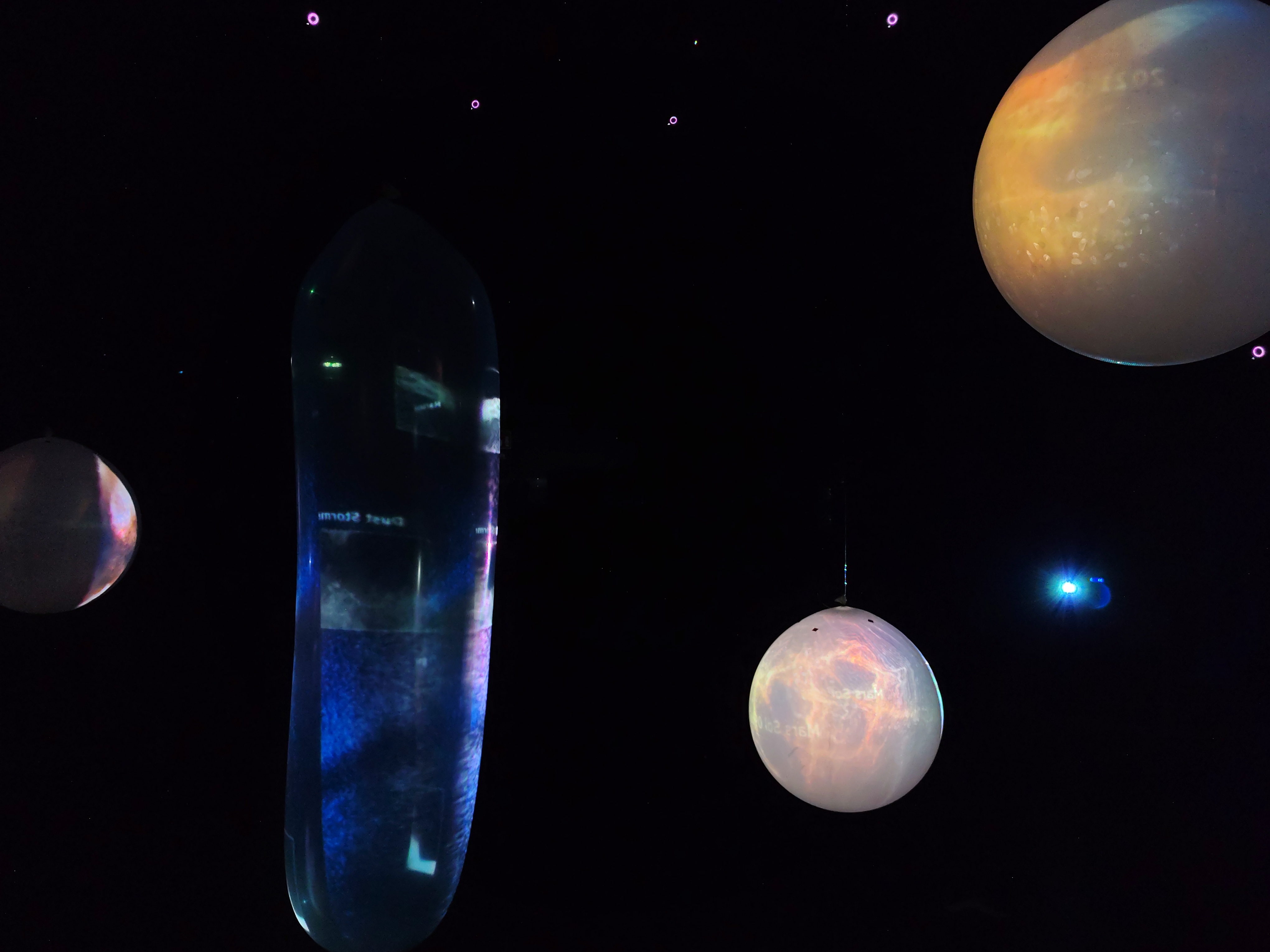 Four balloons are tracked using infrared motion capture, enabling precise projection mapping. The semi-transparent material creates a hologram-like effect, making the visuals appear embedded within the balloons.