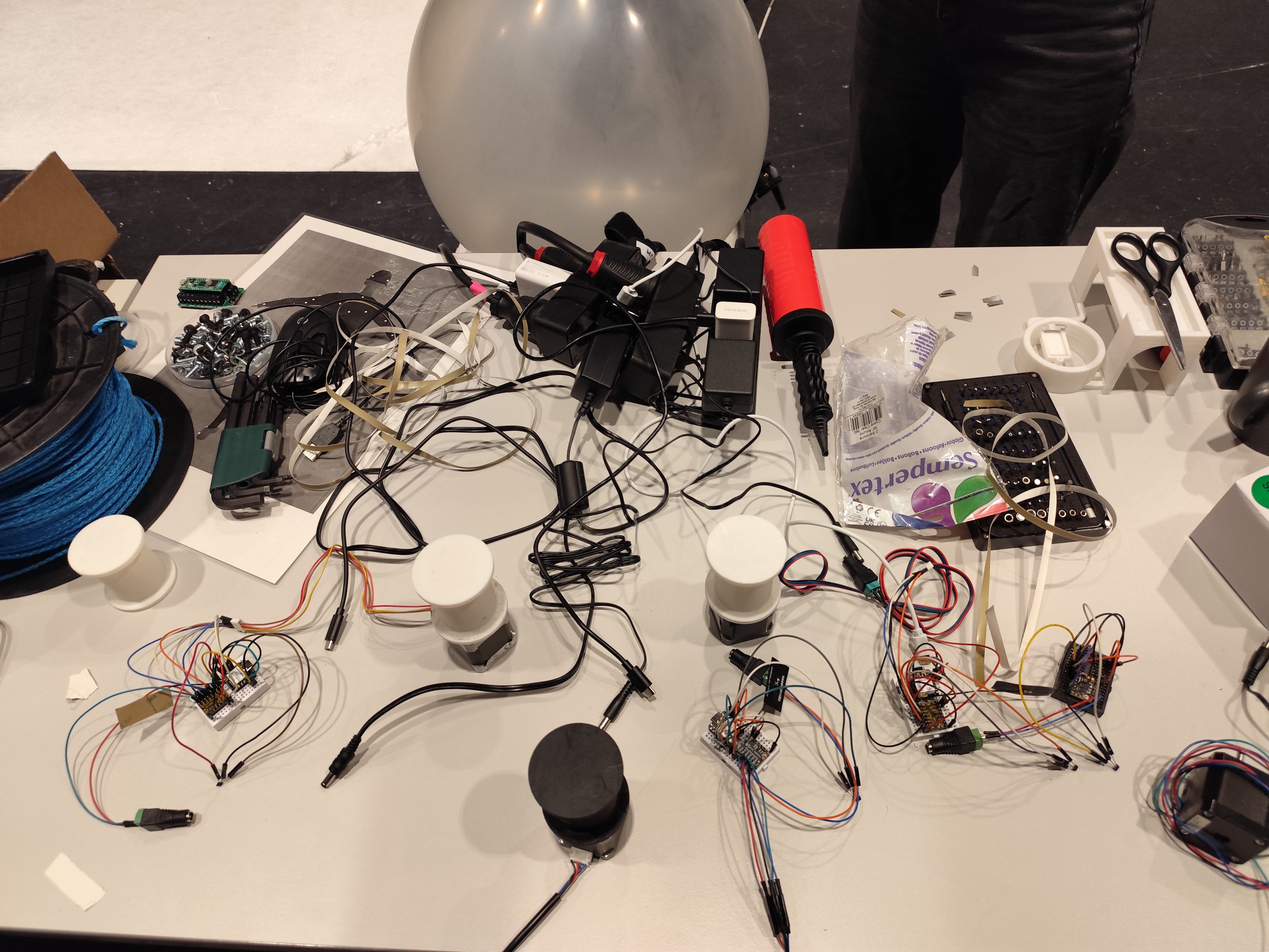 Xiao microcontrollers communicate via WiFi using OSC, controlled through TouchDesigner. A magnetic sensor and magnet at the top of each balloon limit vertical movement for safety.