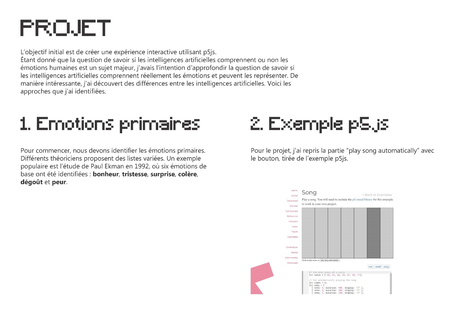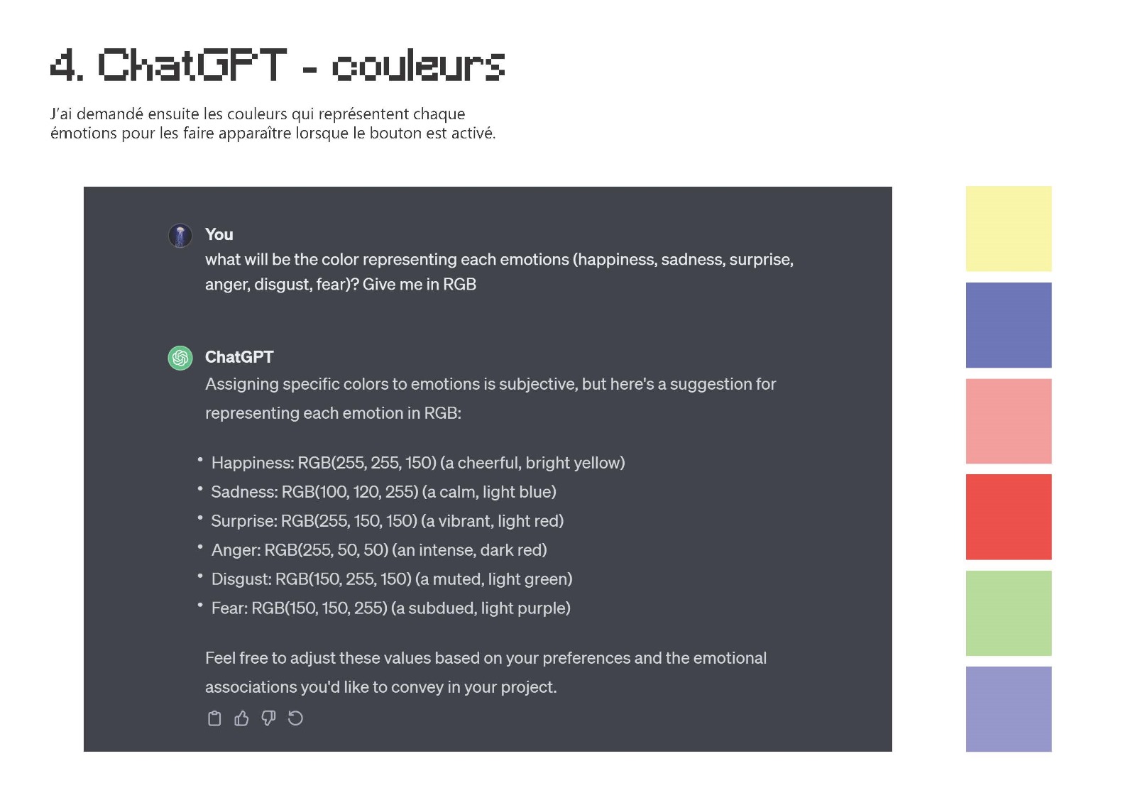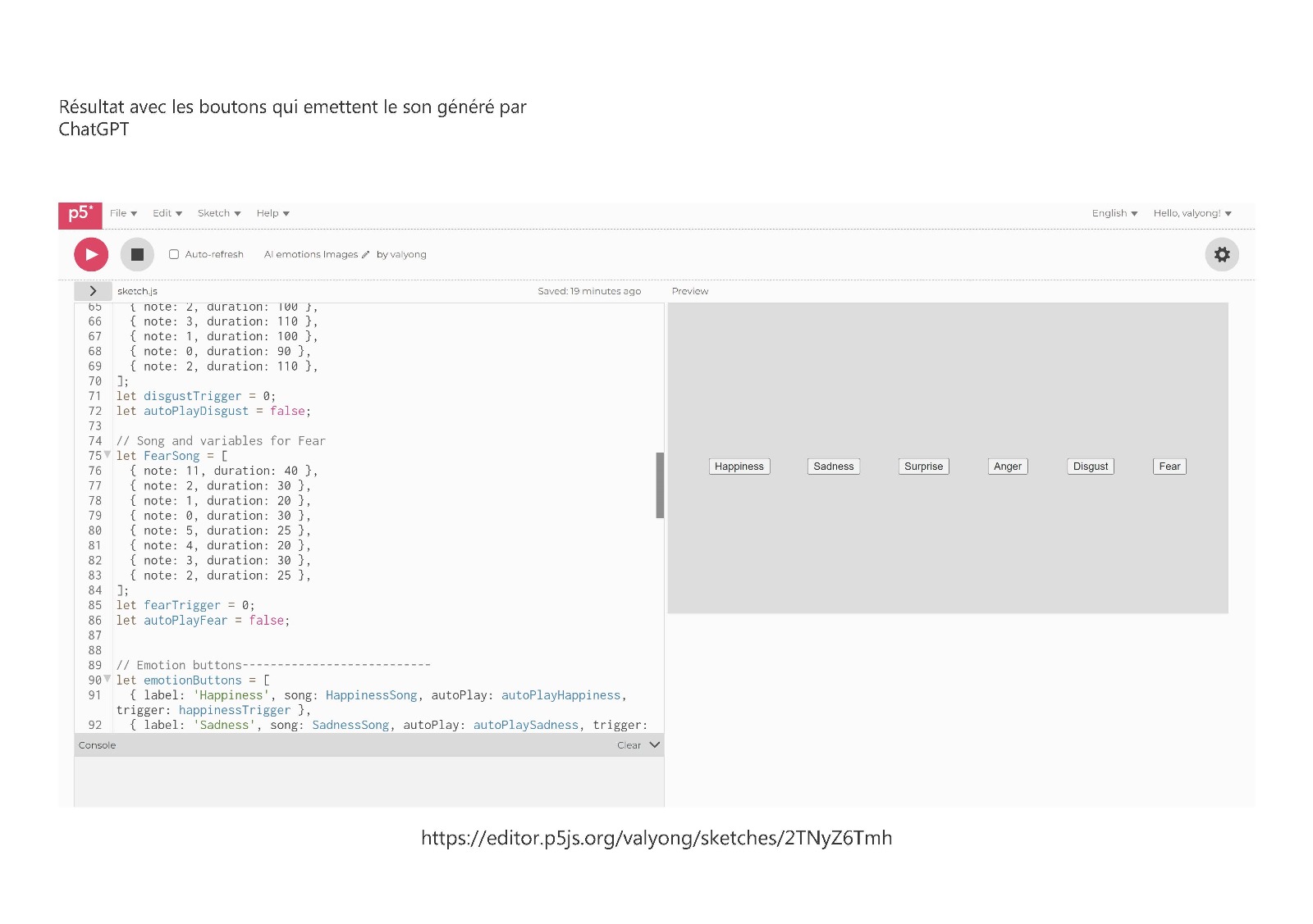 Le résultat final de ce workshop sont les boutons qui font apparaître les notes musicales, les couleurs et les icônes qui expriment six émotion primaires, générées par différents types d’IA.