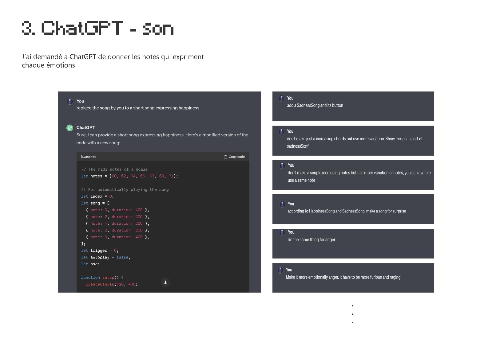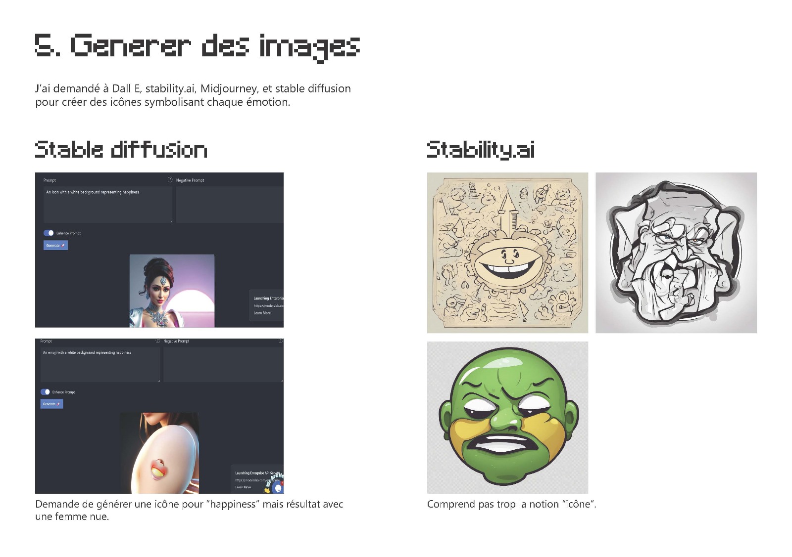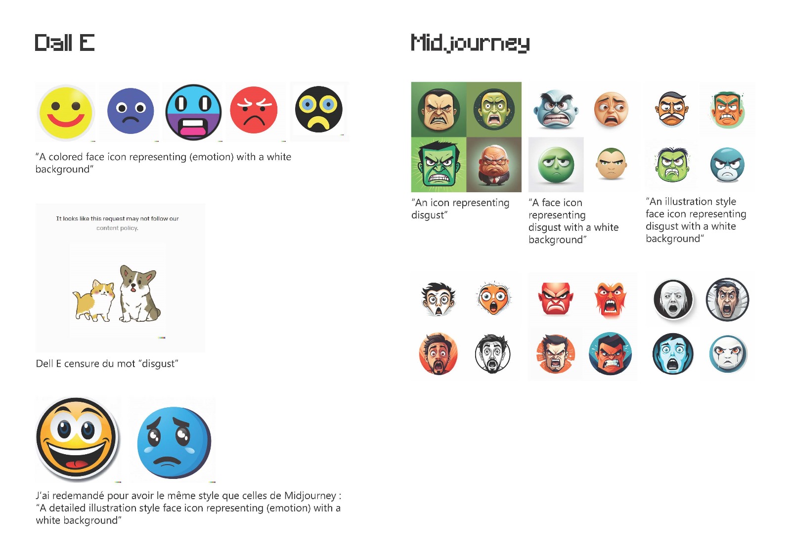 Le résultat final de ce workshop sont les boutons qui font apparaître les notes musicales, les couleurs et les icônes qui expriment six émotion primaires, générées par différents types d’IA.