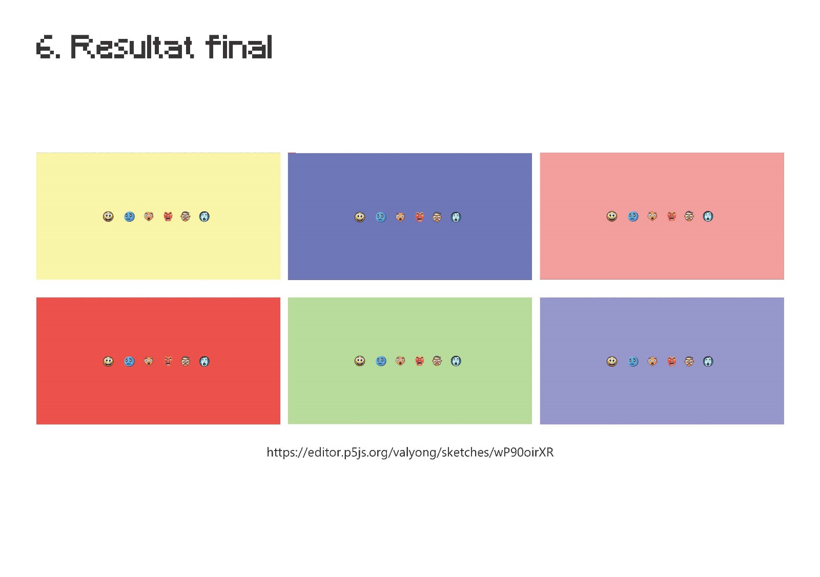 Le résultat final de ce workshop sont les boutons qui font apparaître les notes musicales, les couleurs et les icônes qui expriment six émotion primaires, générées par différents types d’IA.
